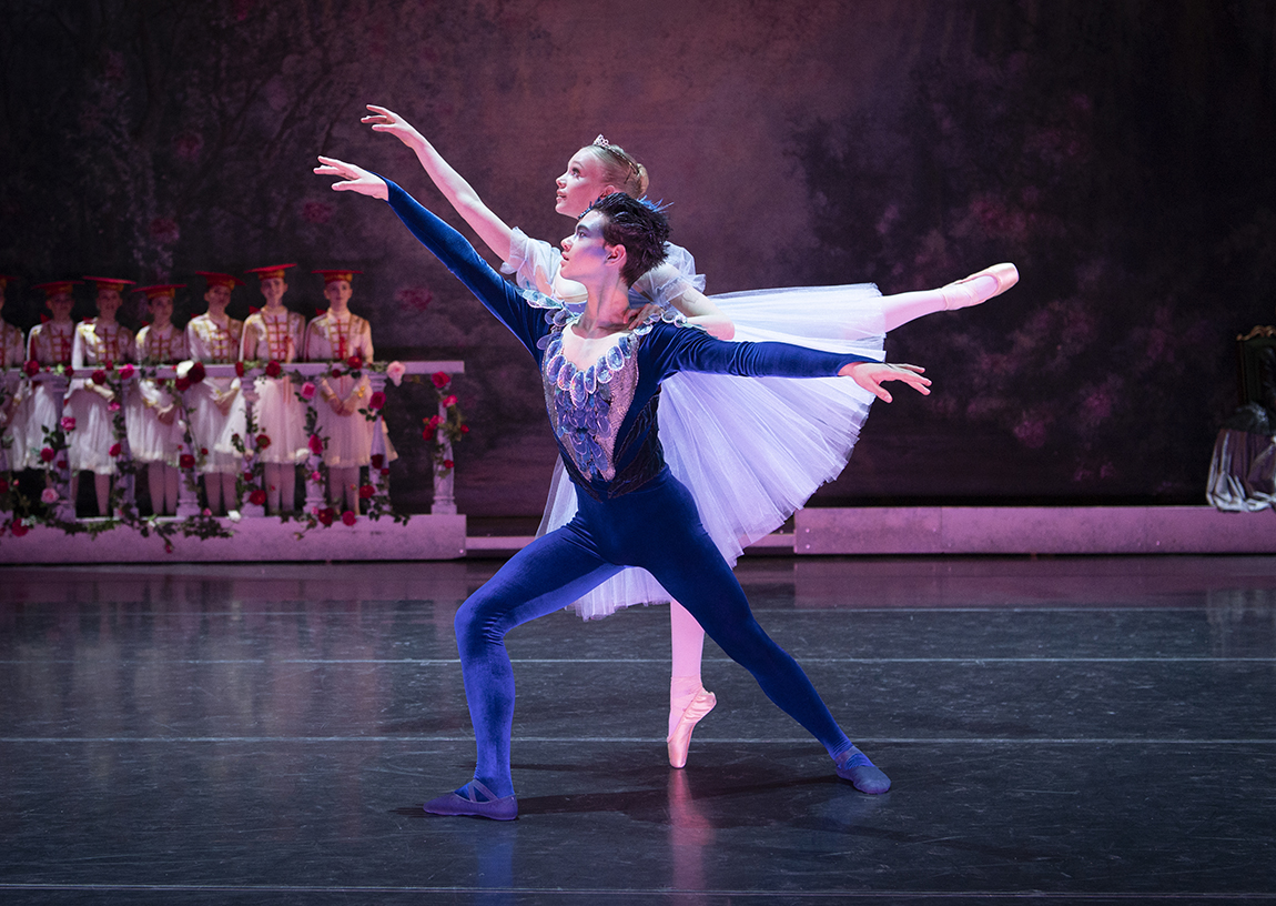 Huvudbild: Selma Nessa Orten och Eliah Paulukat-Vo i pas de deux från «Blå Fågeln» i Lucas Limas Törnrosa. Foto Jörg Wiesner