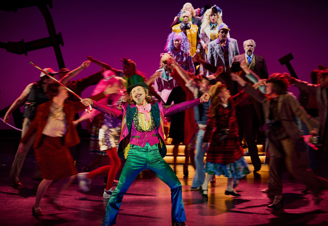 Huvudbild: Ola Salo som Willy Wonka får med sig hela ensemblen i GöteborgsOperans färgsprakande uppsättning av Charlie och chokladfabriken. Foto Lennart Sjöberg