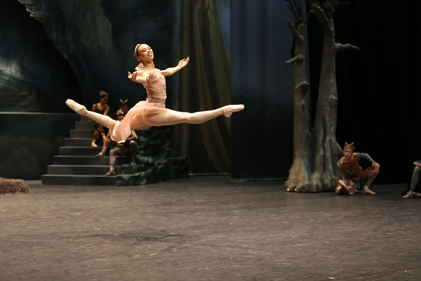 Huvudbild: Nikisha Fogo i en vacker grand jeté från en repetition av Sylvia. Foto Gabriele Schacherl