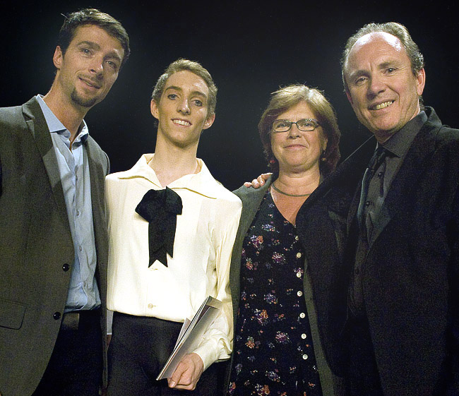 Huvudbild: Guldvinnaren Frei Ruhl omgiven av fr v coachen Brendan Collins, Margareta Lidström, konstnärlig chef Kungliga Svenska Balettskolan och Marc Ribaud, juryns ordförande. Foto C Hillbom
