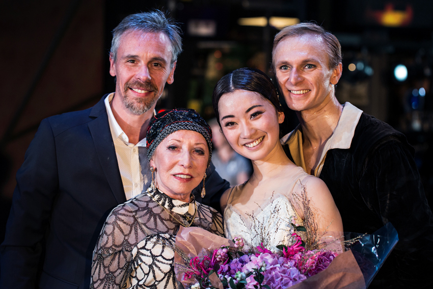 Huvudbild: En nyutnämnd glad premiärdansare Haruka Sassa omgiven av från vänster balettchef Nicolas Le Riche, prima ballerina Natalia Makarova och premiärdansare Dawid Kupinski. Foto Izabella Englund/Kungliga Operan