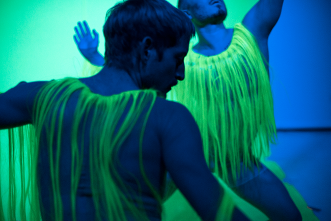 Direkt sensationell var Chrisander Bruns ljusdesign. Han ansvarade också för scenografin. Enhetliga ljusgrå färger förbyttes snabbt till neonillgröngula kostymer (av Tove Berglund) och hudpartier i mörkblå neonglans. Dessutom lyckades han måla en del av fonden i illgröngult. Elegant trolleri!