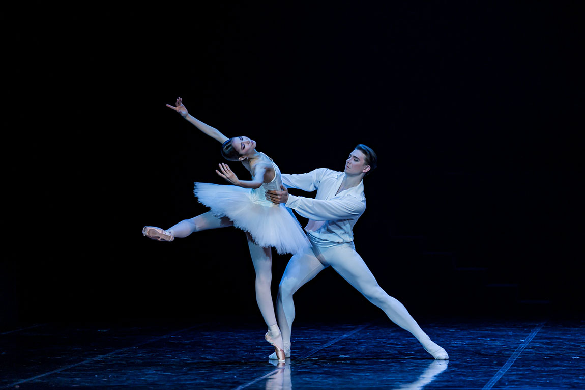 Huvudbild: Ami Morita med William Newton i en ljuvlig cambré i överkroppen i Adagiodelen av Suite en Blanc. Foto Veljo Poom