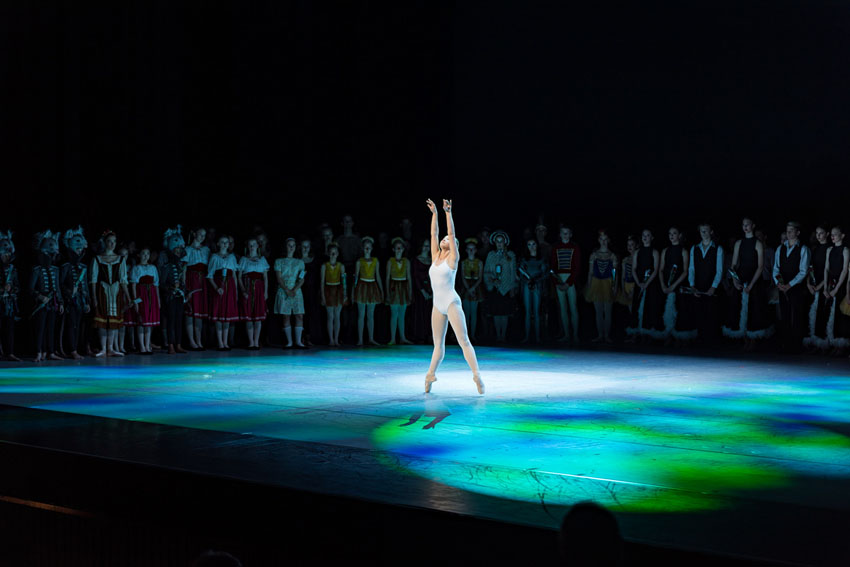 Eleverna på scenen ställer sig i en halvcirkel och framför dem i en ljusspott träder fram en dansare klädd i vitt.