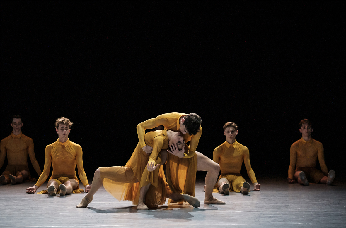 A dramatic change comes as a strong pulse is introduced in a wash of golden light. Greta Calzuola and Théo just take centre stage complementing the change with in a complex, thrilling partnership before Just joins Luca D’Amato in a dynamic male pairing where bodies mirror and complement.